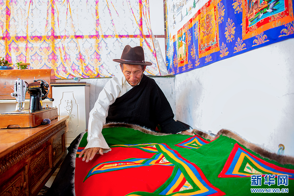“噶爾傳統(tǒng)服飾”地區(qū)級(jí)代表性傳承人石達(dá)次仁在介紹自治區(qū)級(jí)非物質(zhì)文化遺產(chǎn)“噶爾傳統(tǒng)服飾”(6月14日攝)?!案翣杺鹘y(tǒng)服飾”由羊羔皮和呢子內(nèi)外兩面縫制而成,形狀為正方形,制作簡(jiǎn)易,內(nèi)里均為純白色的羊羔皮,羊羔皮既保暖又有裝飾性。新華網(wǎng) 旦增努布 攝