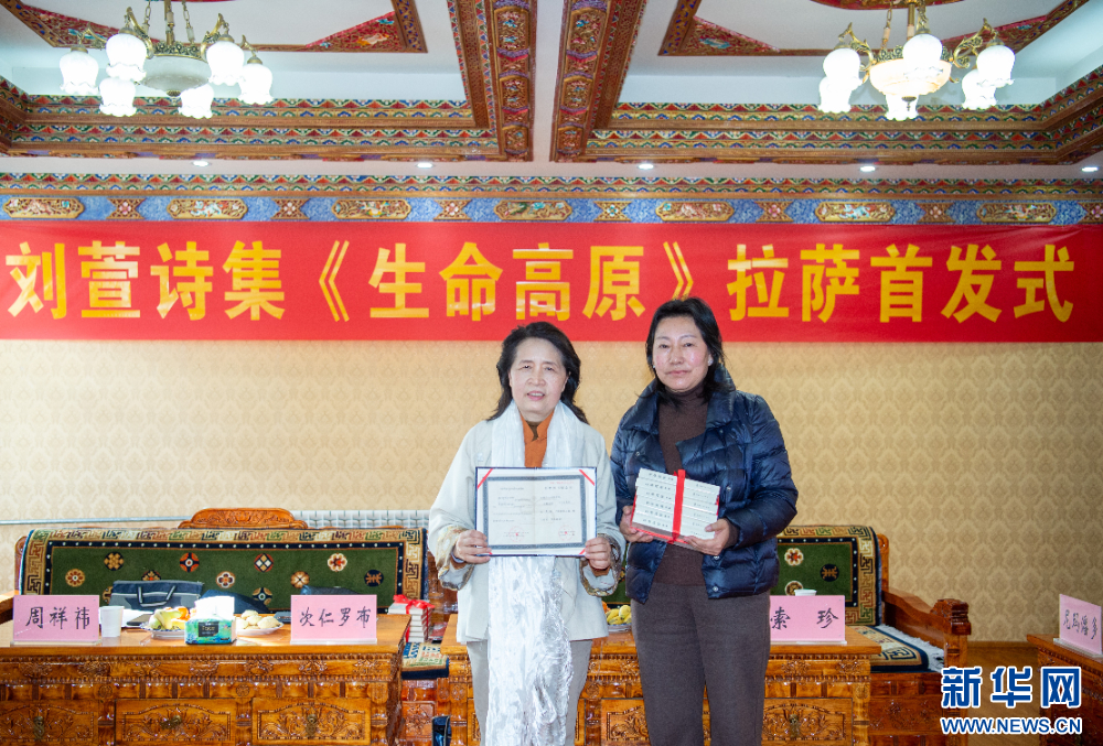 1月15日,在活動(dòng)現(xiàn)場劉萱向西藏自治區(qū)作協(xié)、西藏自治區(qū)圖書館捐贈了《生命高原》詩集。新華網(wǎng) 旦增努布 攝