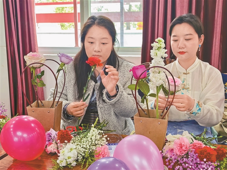 活動(dòng)現(xiàn)場(chǎng)花香四溢、暖意融融?;ㄋ?yán)蠋焽@花材識(shí)別、修剪技巧、色彩搭配等進(jìn)行細(xì)致講解與示范,手把手指導(dǎo)大家選材、剪枝、定形、點(diǎn)綴。大家在花香中舒緩壓力、陶冶情操,在互動(dòng)中增進(jìn)情誼、凝聚共識(shí),充分展現(xiàn)了新時(shí)代女性自信優(yōu)雅、積極向上的精神風(fēng)貌。