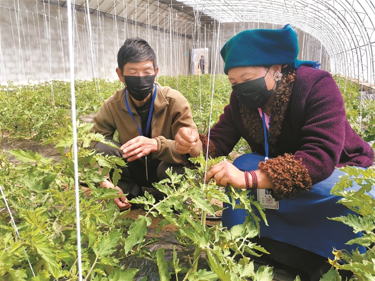 墨竹工卡縣易地扶貧搬遷戶央宗在技術(shù)員的指導(dǎo)下學(xué)習(xí)西紅柿掐苗掛藤技術(shù)