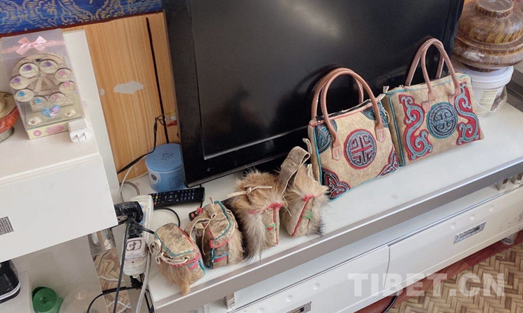 居家的員工們各自縫制著牛皮包、帽子、小掛件等藏族傳統(tǒng)物件,裁片、組合、縫制……一道道工序在他們勤勞的雙手上有條不紊地進行著。