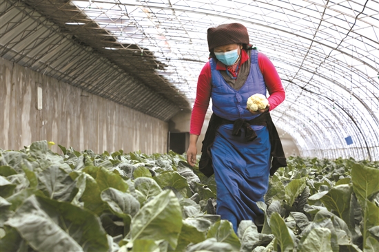 圖為當(dāng)?shù)厝罕娫谀窆たh現(xiàn)代農(nóng)業(yè)示范園溫室大棚收花菜。 拉薩融媒記者 貢嘎來(lái)松攝