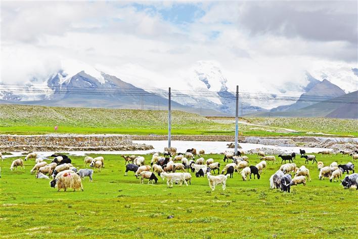圖為雪山腳下的康馬縣薩瑪達(dá)鄉(xiāng)水草豐美,羊群自在覓食。記者 扎西頓珠 攝