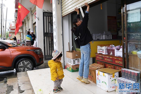 格桑旺姆推開(kāi)蔬菜店的卷閘門準(zhǔn)備營(yíng)業(yè)(8月3日攝)。
