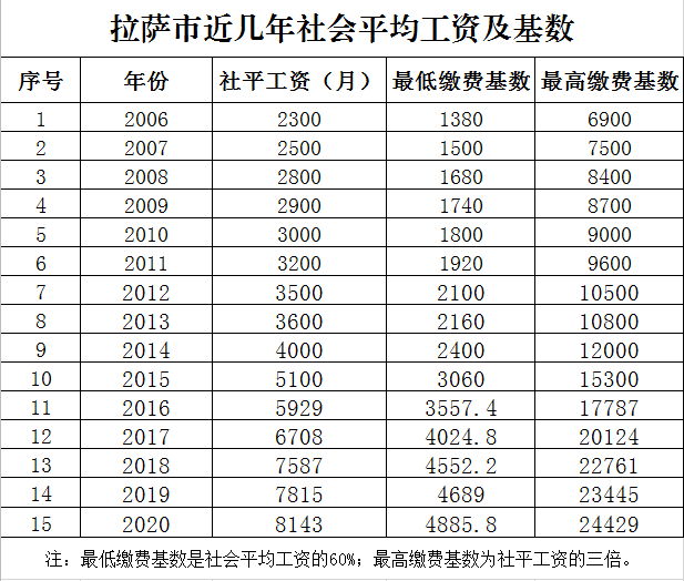 根據(jù)西藏自治區(qū)人社廳、西藏自治區(qū)財政廳、西藏自治區(qū)統(tǒng)計局《關(guān)于發(fā)布2020年上年度全區(qū)職工月平均工資的通知》(藏人社發(fā)〔2020〕82號)精神,2020年社會平均工資為8143元/月,新的繳費基數(shù)上下限及繳費標(biāo)準(zhǔn)從2020年1月1日起執(zhí)行。