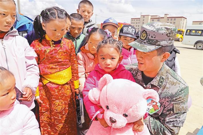 近日,西藏那曲軍分區(qū)官兵帶著禮物和文具來(lái)到孤兒院,看望這里的孩子們,給他們講故事,陪他們做游戲。