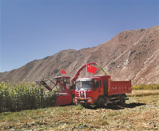 上午11時,收割工作緊張有序進行,多臺青貯收割機開足馬力在田地里奔忙。在齒輪的旋轉(zhuǎn)下,青貯玉米自動收割、粉碎、裝進運輸車,空氣中混合著濃郁清新的草香味,到處是一派繁忙的收獲景象,這為全區(qū)牦牛越冬儲備下了充足的“口糧”。