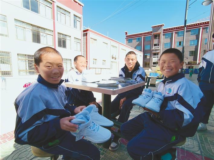 領(lǐng)到運(yùn)動(dòng)鞋的學(xué)生們開(kāi)心不已。記者 扎西頓珠 攝