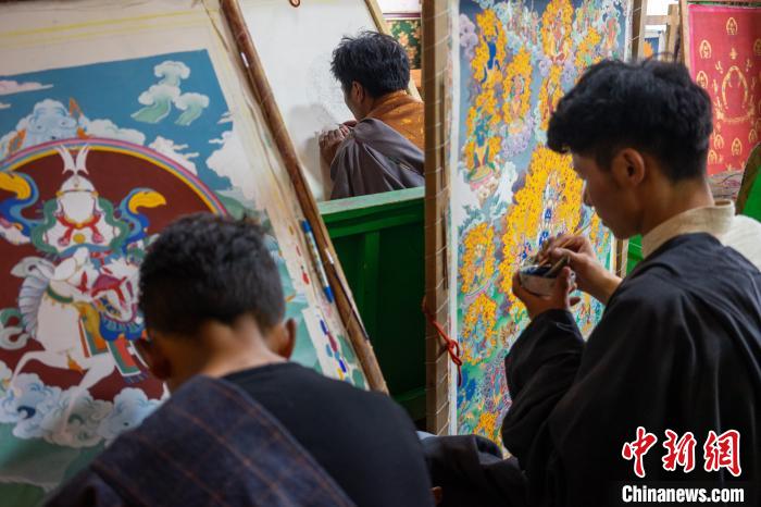 西藏昌都丁青縣象雄東朵唐卡畫派繪畫班的學(xué)員們學(xué)習(xí)唐卡繪制技藝。(資料圖) 江飛波 攝