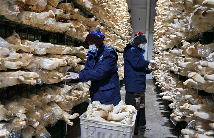圖為生物科技示范園區(qū)內(nèi),工作人員在采摘杏鮑菇。記者 唐斌 次旺 攝