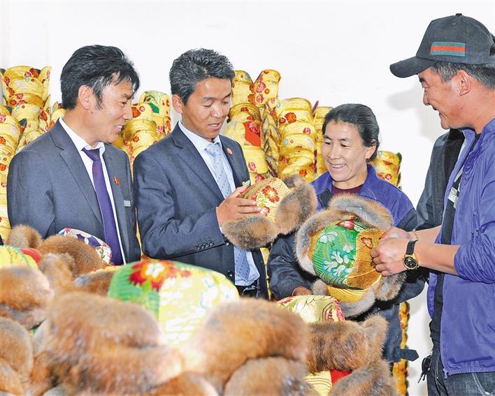 農(nóng)行山南扎囊縣支行客戶經(jīng)理(左二)來到扎囊縣扎塘鎮(zhèn)羊嘎村藏式帽子次仁金果農(nóng)民專業(yè)合作社對接產(chǎn)業(yè)扶貧項目。