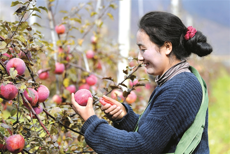 日前,西藏林芝市晚熟蘋果喜獲豐收,當(dāng)?shù)剞r(nóng)牧民在果園忙著采摘蘋果。據(jù)悉,西藏林芝市栽種蘋果約3.78萬畝,預(yù)計全年產(chǎn)量可達(dá)1.5萬噸,產(chǎn)值1.7億元。林芝市素有“西藏江南”之稱,是西藏重要的水果生產(chǎn)基地。近年來,林芝市立足高原生態(tài)氣候特點,開展蘋果“新品種、新技術(shù)、新模式、新農(nóng)藝”研發(fā)和應(yīng)用推廣,果實品質(zhì)不斷改良。
