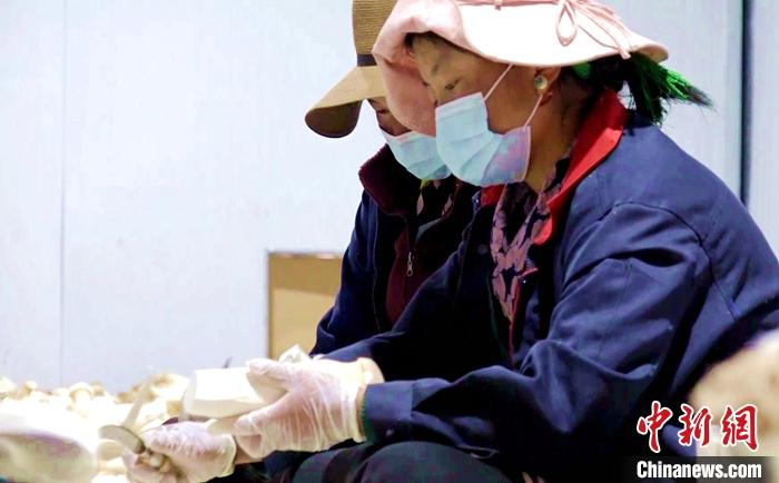 圖為11月17日,西藏日喀則市謝通門縣農牧民在該縣一生物科技企業(yè)清理食用菌。中新社記者 貢桑拉姆 攝