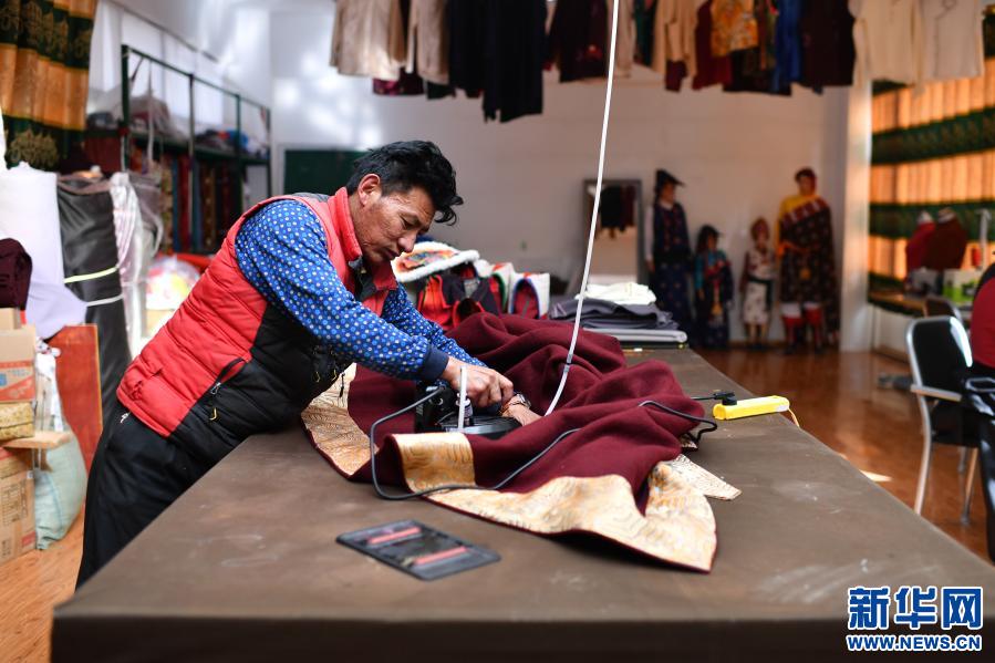 在西藏昌都市江達(dá)縣格?;褡宸椉庸やN售公司,江達(dá)縣字嘎鄉(xiāng)塔字村村民扎西江措在制作藏裝(4月30日攝)。扎西江措學(xué)習(xí)制作藏裝不到兩年時間,已經(jīng)是一名熟練的制衣工,現(xiàn)在每個月有4000多元的收入。新華社記者 詹彥 攝