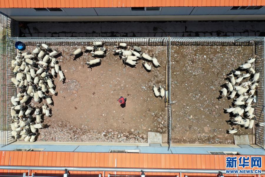 在西藏昌都市貢覺縣莫洛鎮(zhèn)阿旺綿羊繁育基地,阿果村村民色秋在查看綿羊的生長情況(5月2日攝,無人機(jī)照片)。2016年,色秋來到阿旺綿羊繁育基地打工,很快就學(xué)會了綿羊的養(yǎng)殖技術(shù),現(xiàn)已成為繁育基地的一把好手,月工資漲到了4400元。新華社記者 詹彥 攝