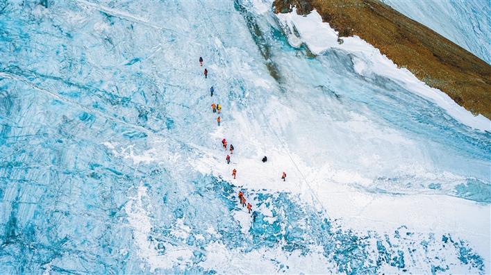 圖為當(dāng)雄縣格達(dá)鄉(xiāng)境內(nèi)的廓瓊崗日冰川公園內(nèi),游客與冰川近距離接觸,體驗(yàn)攀登的樂趣。