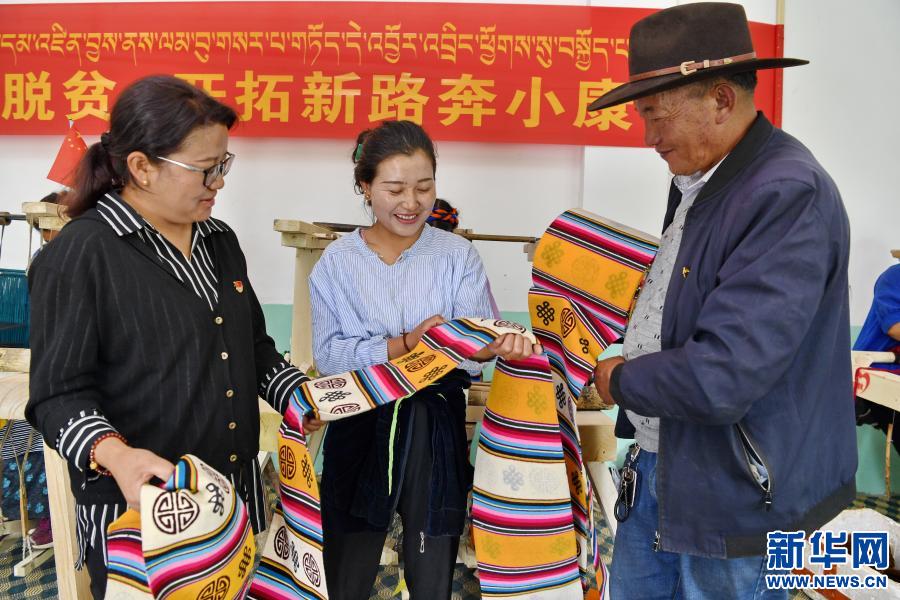 2020年7月6日,西藏扎囊縣吉汝鄉(xiāng)扎西林村駐村工作隊(duì)隊(duì)長央珍(左)、黨支部書記旺扎(右)和專業(yè)合作社社員次旺曲珍查看民族手工業(yè)(邦典)質(zhì)量。 新華社記者 張汝鋒 攝