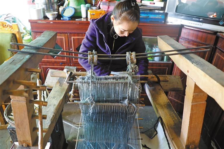圖為山南市措美縣卓德村村民德吉措姆在務工返鄉(xiāng)期間編織毛毯。白瑪頓珠 攝