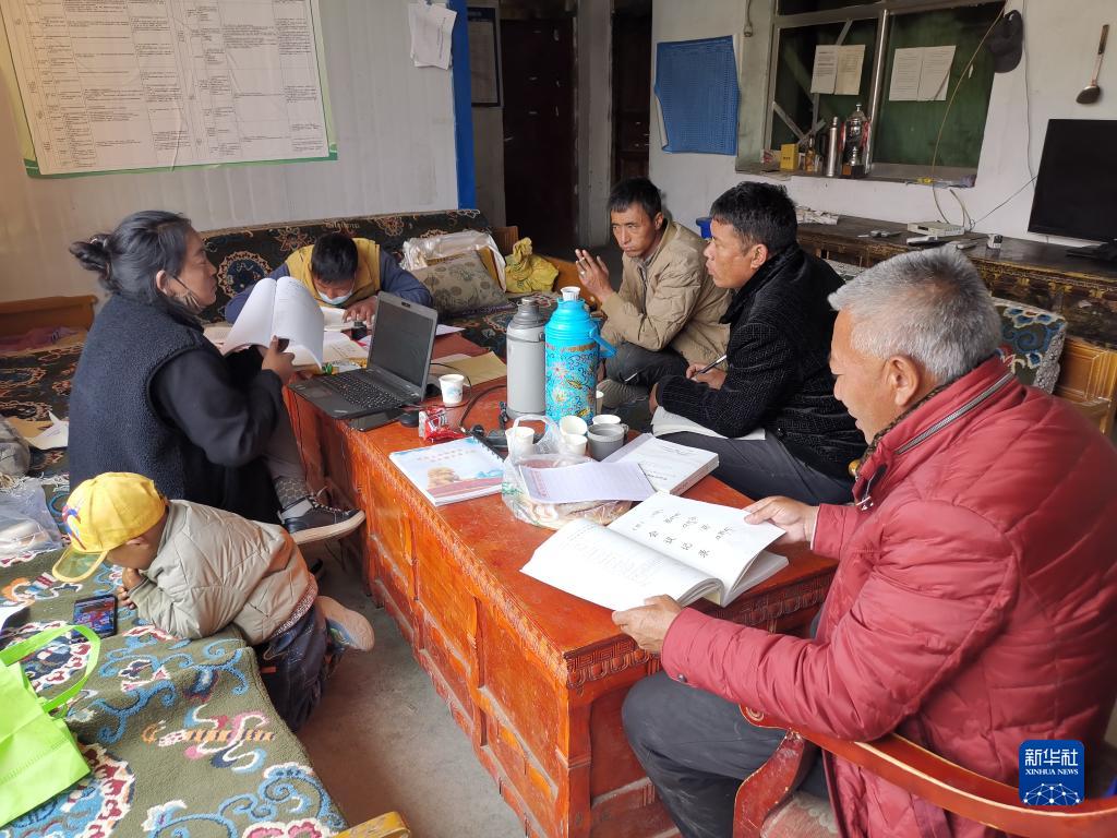 在特布拉村,駐村第一書記吉宗(女,左一)正與其他村干部開會,商討農(nóng)村廁所改造事宜。新華社記者 林建楊 攝(手機(jī)照片,4月16日攝)