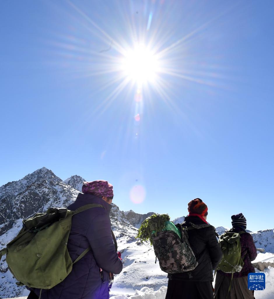 西藏亞東縣仁青崗村的達(dá)吉、次仁曲珍和普赤三位藏族老阿媽在前往詹娘舍哨所送菜的路上(2022年1月27日攝)。新華社記者 覺果 攝