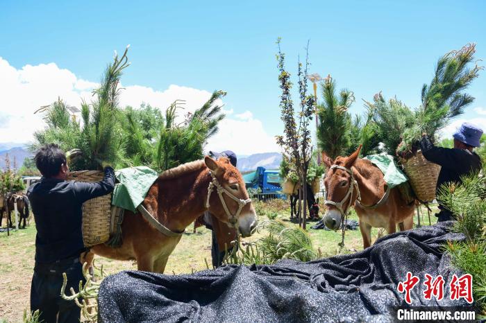 圖為拉薩南北山綠化工程,工人用騾子搬運樹苗 貢嘎來松 攝