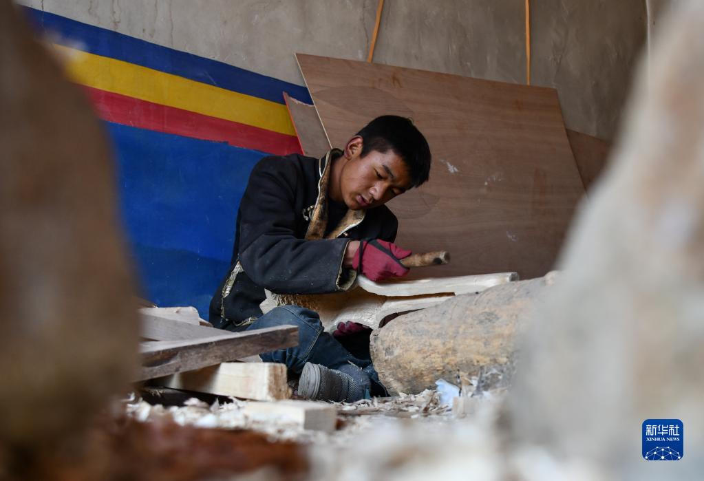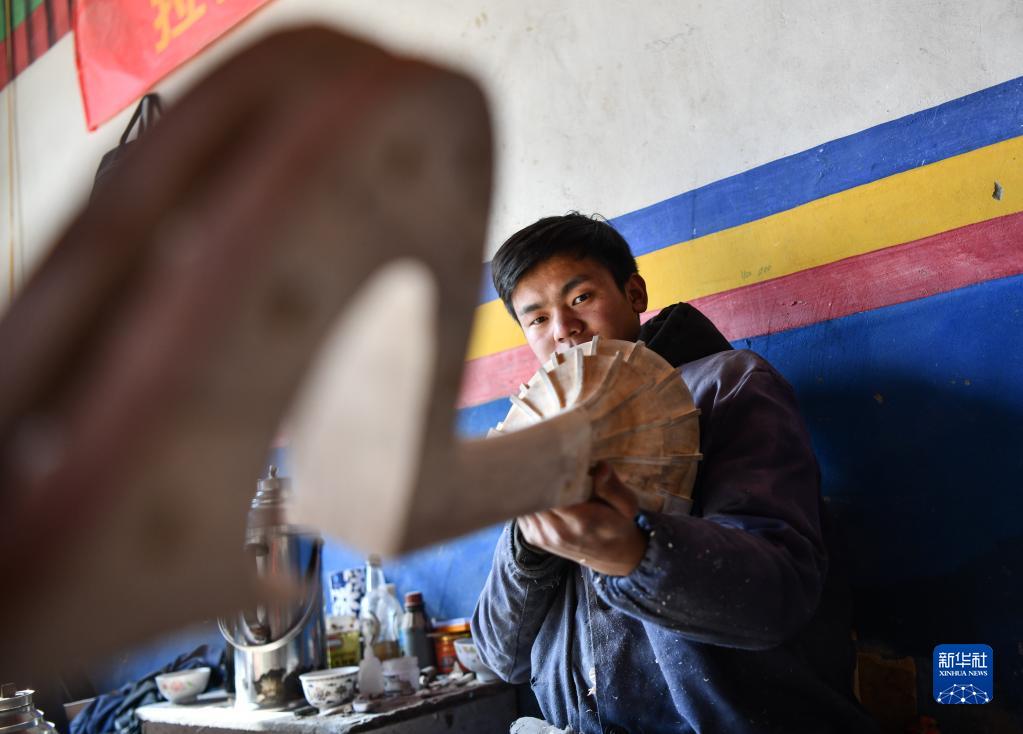 索朗瓊拉的大兒子在制作扎念琴(1月19日攝)。新華社記者 晉美多吉 攝