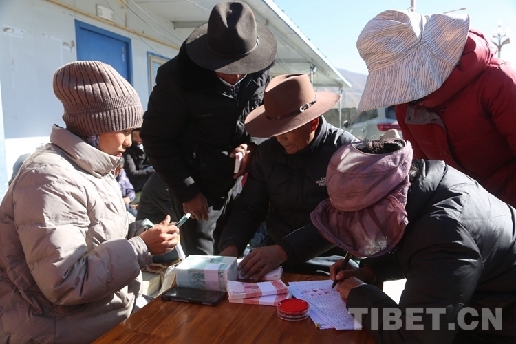 圖為村民領(lǐng)取分紅款 攝影:白瑪論珠