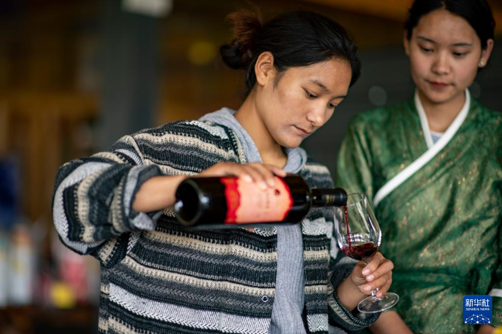 7月26日,桑日縣一家葡萄酒企業(yè)的員工曲珍(左)在跟同事一起練習(xí)企業(yè)葡萄酒產(chǎn)品介紹。新華社記者 旦增尼瑪曲珠 攝
