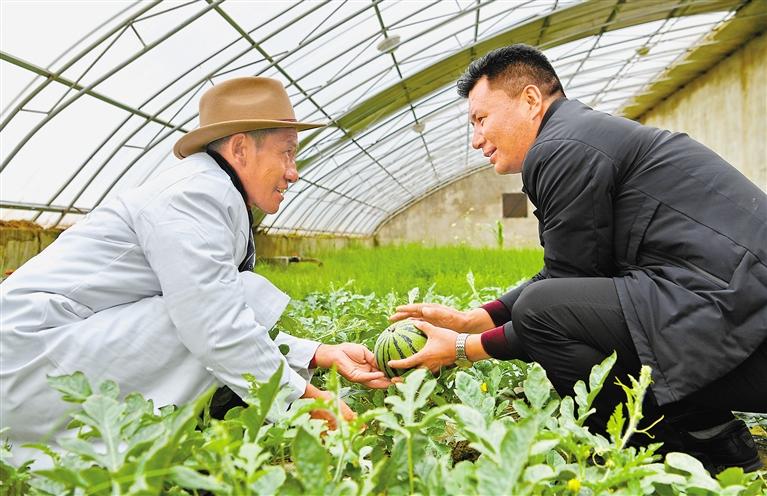 圖為措勤縣農牧業(yè)技術推廣站站長吾金次仁(右)和措勤縣高原生態(tài)畜牧業(yè)現代化養(yǎng)殖一體化產業(yè)綜合基地合作社負責人扎西桑布在西瓜大棚里交流。 新華社記者 張汝鋒 攝