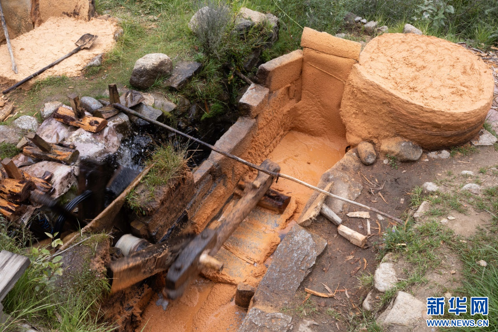 圖為水磨不斷研磨柏木使其成漿(8月21日攝)。新華網發(fā) 李騰 攝