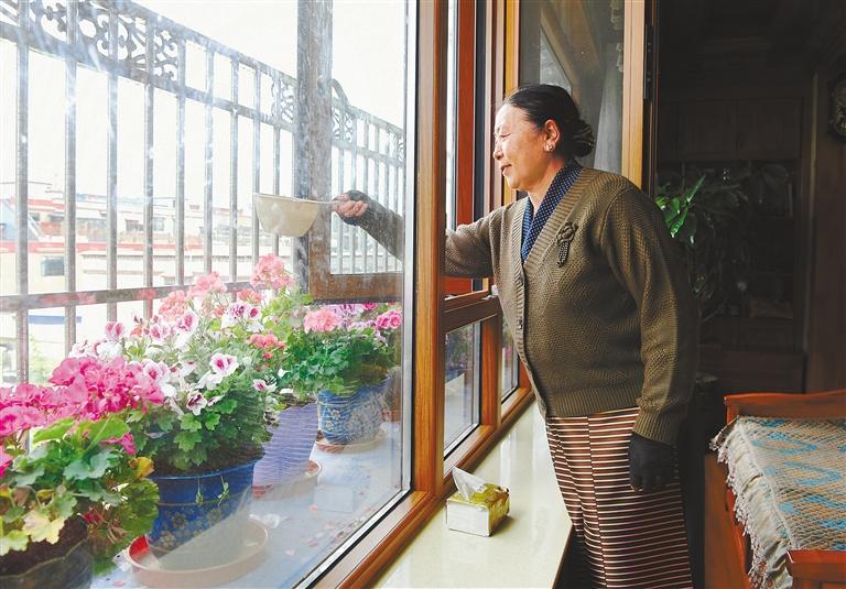 目前,西藏住房保障已覆蓋所有地市、縣(區(qū))和鄉(xiāng)鎮(zhèn),構(gòu)建了以周轉(zhuǎn)房、公共租賃住房(廉租房)為主體,推進(jìn)城鎮(zhèn)棚戶區(qū)改造和城鎮(zhèn)老舊小區(qū)改造的住房保障體系,通過(guò)實(shí)物配租與租賃補(bǔ)貼并舉方式,基本實(shí)現(xiàn)了城鎮(zhèn)低保和低收入住房困難家庭應(yīng)保盡保。 圖為居住在拉薩市城關(guān)區(qū)加榮棚戶區(qū)小康安居園的央金,在家里澆花。記者 蔣蓋 攝