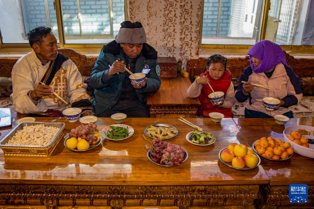 申扎縣馬躍鄉(xiāng)貝嘎四村村民次仁曲達(左一)家在吃飯,桌上的新鮮蔬菜和水果都是在村里的偏遠鄉(xiāng)鎮(zhèn)果蔬配送試點項目直銷點采購的,由供銷合作社當天配送而來(1月5日攝)。新華社記者 姜帆 攝