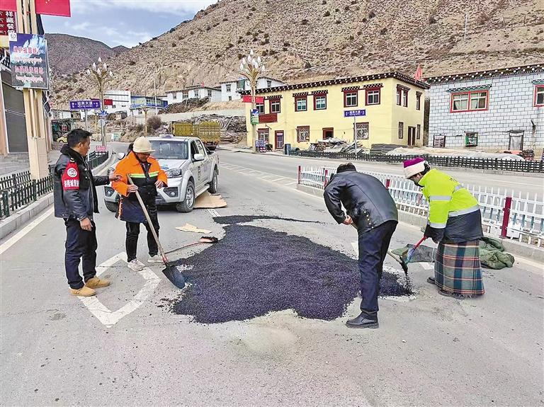 圖為洛隆縣組織公路養(yǎng)護(hù)段開展路面修復(fù)工作。記者 貢秋曲措 攝
