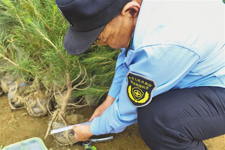 在拉薩南北山綠化工程2024年度鞏固提升(貢嘎機(jī)場(chǎng)周邊山體)工程項(xiàng)目上,林業(yè)檢疫執(zhí)法工作人員在檢查樹(shù)苗根部土球是否達(dá)標(biāo)。 新華社記者 晉美多吉 攝