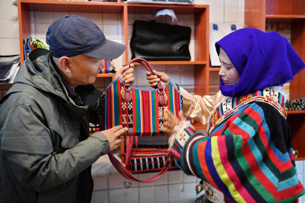 倉秋多吉通過網(wǎng)絡(luò)銷售當(dāng)?shù)氐漠a(chǎn)品(8月24日攝)。