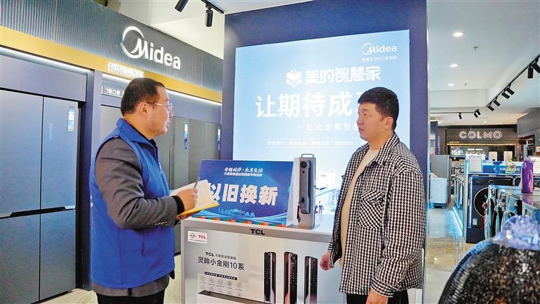 圖為在拉薩家具家電以舊換新專場(chǎng),消費(fèi)者向銷售人員了解相關(guān)政策。記者 貢曲羅杰 攝