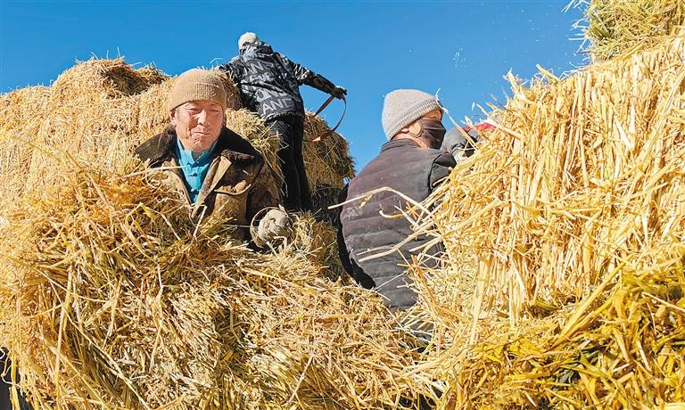村民們在卸載飼草。記者 姚聞 攝