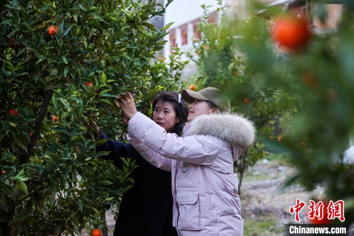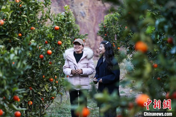 12月20日,冬至前夕,西藏自治區(qū)昌都市芒康縣納西民族鄉(xiāng)加達村橘子園里一片繁忙景象。納西民族鄉(xiāng)地處瀾滄江河谷,以山地為主,瀾滄江穿境而過,河谷地帶土地肥沃,黃澄澄的康巴蜜橘掛滿枝頭,果農(nóng)們穿梭其中,熟練地采摘已成熟的果實。圖為游客在橘子園中自拍留念。中新社記者 薛蒂 攝