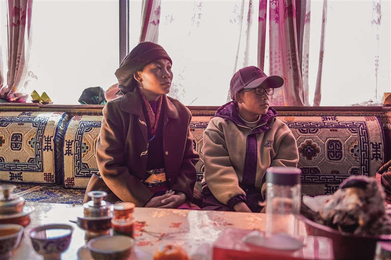 當(dāng)日,天空晴朗,在廣袤無垠、無樹木遮擋的曠野上,稍起一陣疾風(fēng),便會(huì)揚(yáng)起一層薄薄的黃沙。從村委會(huì)出發(fā),沿著冰湖畔的水泥小路前行,很快就來到了村民倫珠曲珍的家。一進(jìn)屋,厚實(shí)的木門便將凜冽的寒風(fēng)擋在了門外?!翱煺?qǐng)進(jìn),這幾天風(fēng)沙有點(diǎn)大,普莫雍措都沒以前藍(lán)了?!眰愔榍湟贿呹P(guān)門一邊熱情地笑著說道。