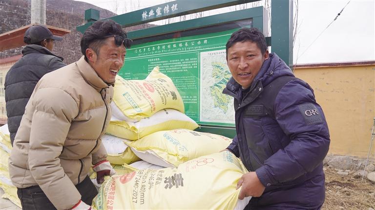 村民正在領(lǐng)取肥料。圖由益西曲珍提供