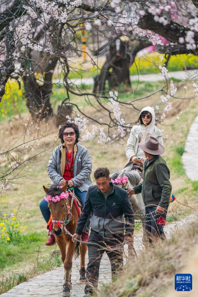 4月2日,游客在林芝市嘎拉村體驗(yàn)馬背觀花。新華社記者 丁增尼達(dá) 攝
