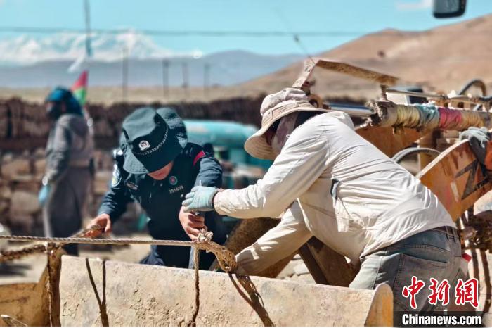 圖為西藏出入境邊防檢查總站第十四批駐村工作隊隊員與當?shù)卮迕窆餐_展災后重建。徐廣立 攝