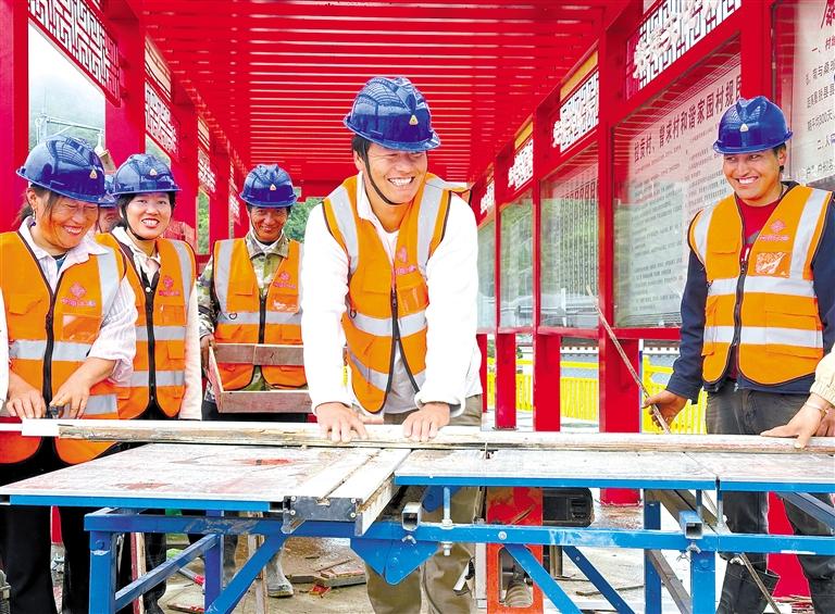 圖為村莊基礎(chǔ)設(shè)施提升項目現(xiàn)場,曾求村村民在加工木材。記者 旦增蘭澤 通訊員 朗玲 攝