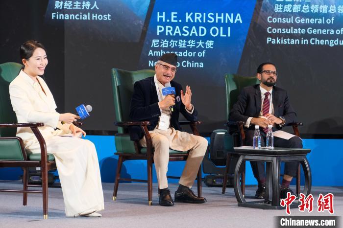 圖為6月27日,尼泊爾駐華大使(中)與巴基斯坦駐成都總領(lǐng)館總領(lǐng)事(右)在“環(huán)喜馬拉雅”企業(yè)家國(guó)際會(huì)議上參與對(duì)話活動(dòng)。江飛波 攝