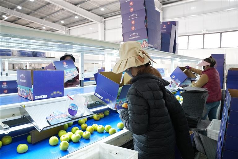 除了田間基地,蘋果產(chǎn)業(yè)鏈的延伸還為群眾帶來了更多就業(yè)選擇。位于洞嘎鎮(zhèn)巴基塘的智能化蘋果分揀車間于今年新建落成,車間內(nèi)流水線高效運(yùn)轉(zhuǎn),工人們熟練地分揀、裝箱、搬運(yùn)蘋果,空氣中的果香愈發(fā)濃郁。據(jù)車間負(fù)責(zé)人介紹,近期正忙著為電商平臺備貨,每天有16名工人負(fù)責(zé)打包1200余箱蘋果;因發(fā)貨繁忙,車間還額外雇傭了當(dāng)?shù)嘏R時(shí)工,讓農(nóng)閑群眾多了一份收入。