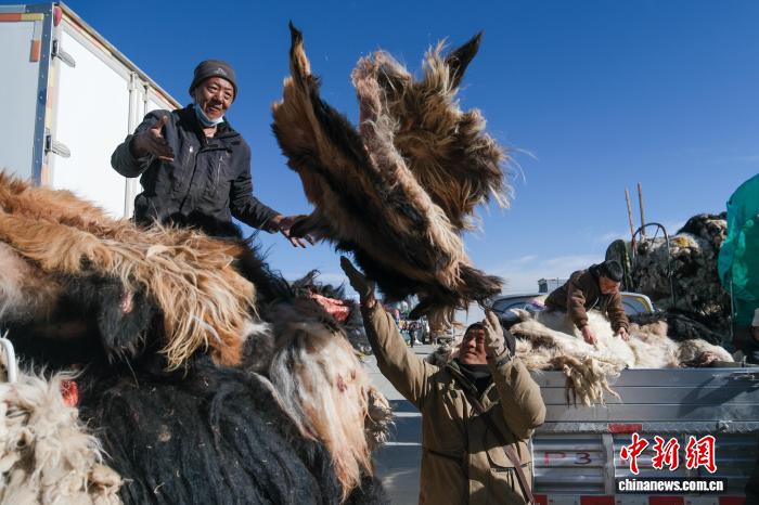 12月15日,西藏自治區(qū)那曲市第十八屆畜產(chǎn)品展銷會上,牧民在整理待售的羊皮。中新社記者 江飛波 攝