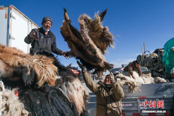 12月15日,西藏自治區(qū)那曲市第十八屆畜產(chǎn)品展銷會(huì)上,牧民在整理待售的羊皮。江飛波 攝