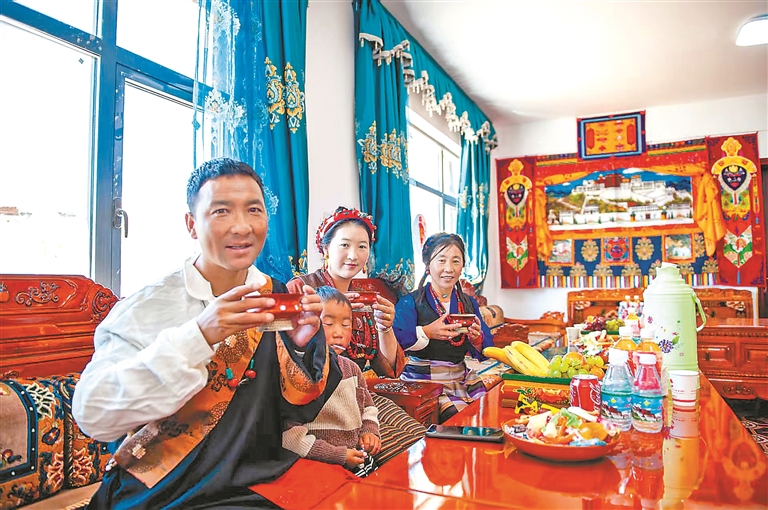 圖為定結縣乃村村民在喝新房里的第一杯酥油茶。記者 旦增嘎瓦 攝