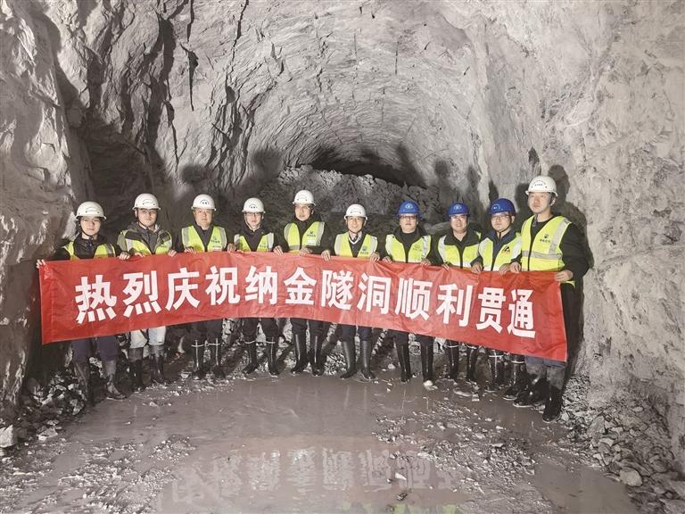 納金隧洞全長5036米,成型斷面為城門洞形,寬3.0米、高3.7米,采用鉆爆法從兩端相向開挖。隧洞穿越中高山地貌,最大埋深約640米,隧洞圍巖以Ⅲ類為主,Ⅳ、Ⅱ類次之。自開工以來,項目團隊科學(xué)組織、精細管理,克服了高海拔隧洞產(chǎn)生的巖爆和集中涌水等惡劣地質(zhì)環(huán)境,嚴格采取相應(yīng)支護與封堵措施,連續(xù)5個月單側(cè)工作面月進尺超過200米,最高月進尺245米。后續(xù)納金隧洞工程將轉(zhuǎn)入隧洞混凝土襯砌施工,項目部將提前謀劃,精心組織,保證施工質(zhì)量與安全,做好轉(zhuǎn)序工作,確保納金隧洞首倉襯砌混凝土按計劃開倉澆筑。