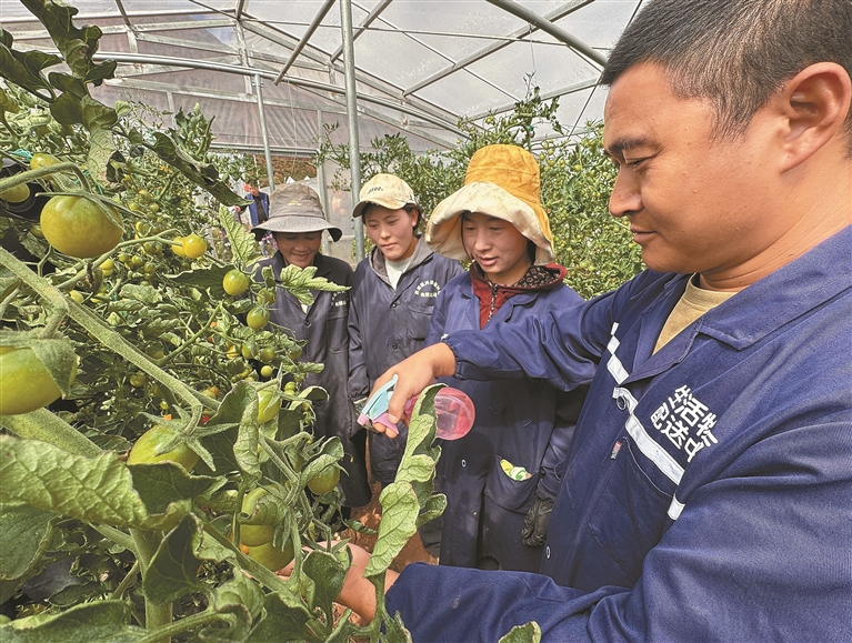圖為貢覺縣現(xiàn)代農業(yè)產業(yè)園的技術員向當?shù)鼐蜆I(yè)青年教授小番茄種植技術。記者 白瑪澤旺 次仁平措 攝